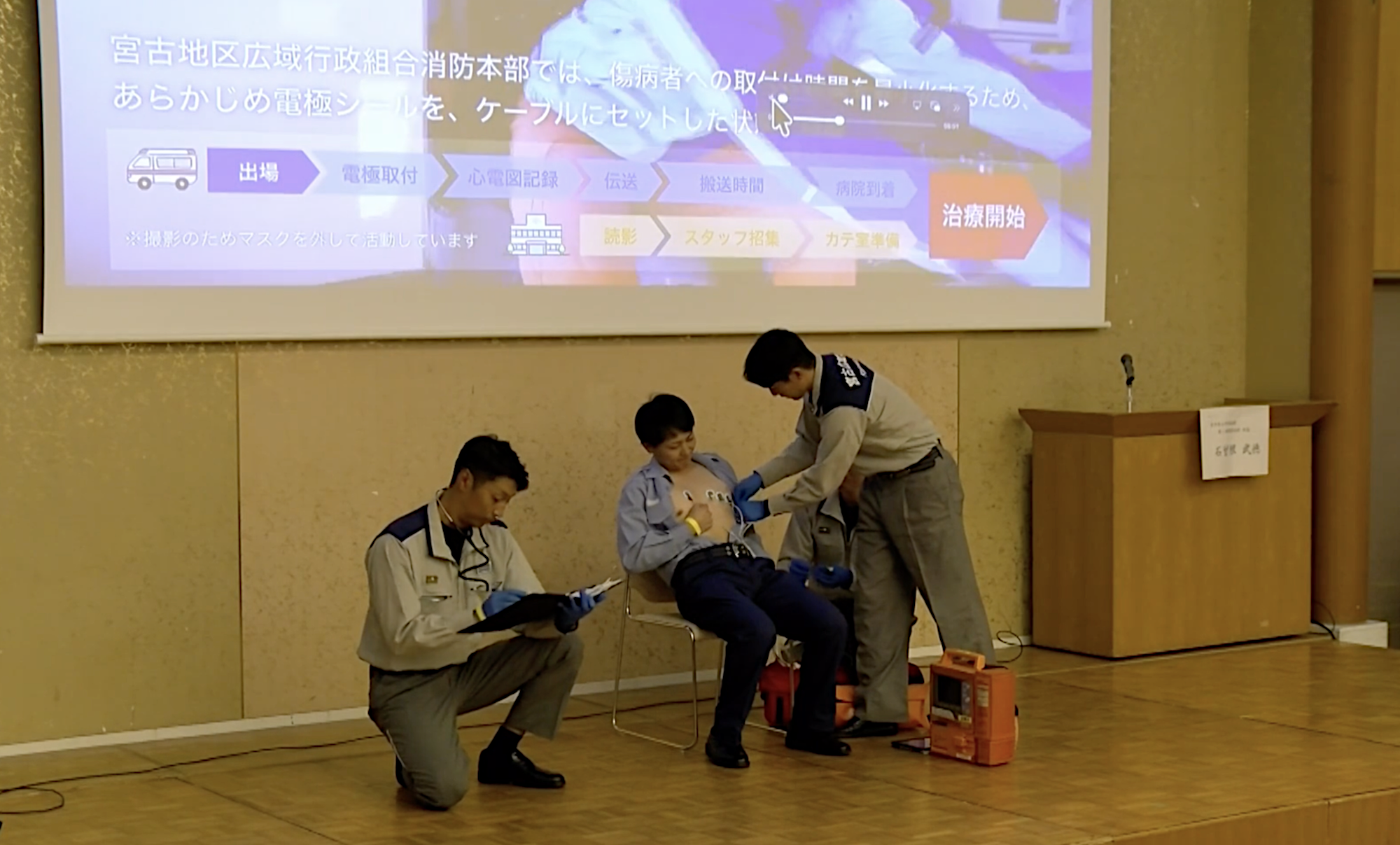 デモンストレーションでは、「宮古消防・メハーゲン」チーム、「花巻消防・日本光電」チーム、「二戸消防・グッドケア」チームに寸劇形式でご協力いただきました。「宮古消防・メハーゲン」チームは、長年の運用経験を生かし、現場での円滑な測定と伝送、病院との良好な連携を見事に表現されていました。「花巻消防・日本光電」チームは、きびきびとした現場対応に加え、マイナ保険証の運用を演技に織り交ぜた実践的な内容で大変参考になりました。「二戸消防・グッドケア」チームは、「意識消失」という胸痛以外の訴えからSTEMIを検出するという新たな視点を提示し、カシオペア基準発祥の地ならではの内容でした。各チームには事前に教育的な動画を作成していただき、現場での心電図伝送の流れや地域ごとの工夫を分かりやすくまとめてくださいました。オンデマンド配信で、ぜひご覧いただければと思います。