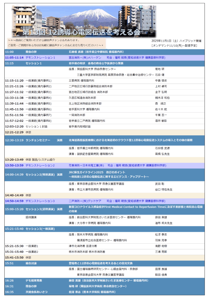 目次第13回 12誘導心電図伝送を考える会 プログラム(10/21更新:最終版) プログラムをダウンロード 戻る 活動報告 第13回 12誘導心電図伝送を考える会 12誘導心電図伝送を考える会 令和7年度の幹事名簿を更新しました